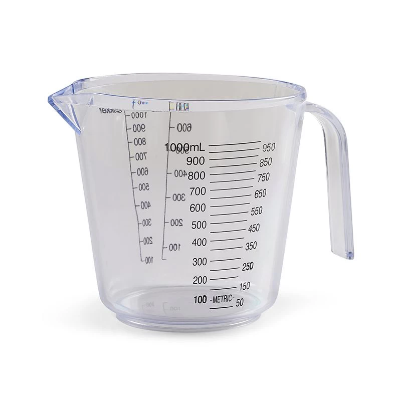 Aldente målekande med angivelser i deciliter. Måler op til 1000 ml. Målebæger.