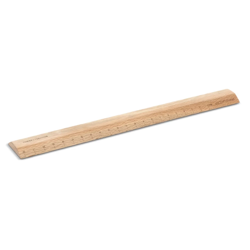 Linealen har letlæselig centimeterafmærkning op langs den ene side samt afmærkning til ringene til en kransekage langs den anden.