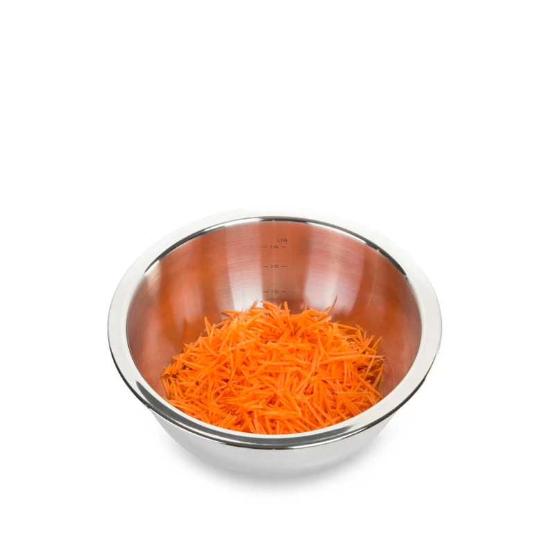 Stålskål Ø24 cm med litermål. Kapacitet op til 4,0 ltr. Inkl. multi-plate og låg med vakuum funktion. Tryk let på låget 3-4 gange og aktiver vakuum funktionen, så grøntsagerne holder sig længere friske. Passer til mandolinjern V5 og vaffel-rivejern