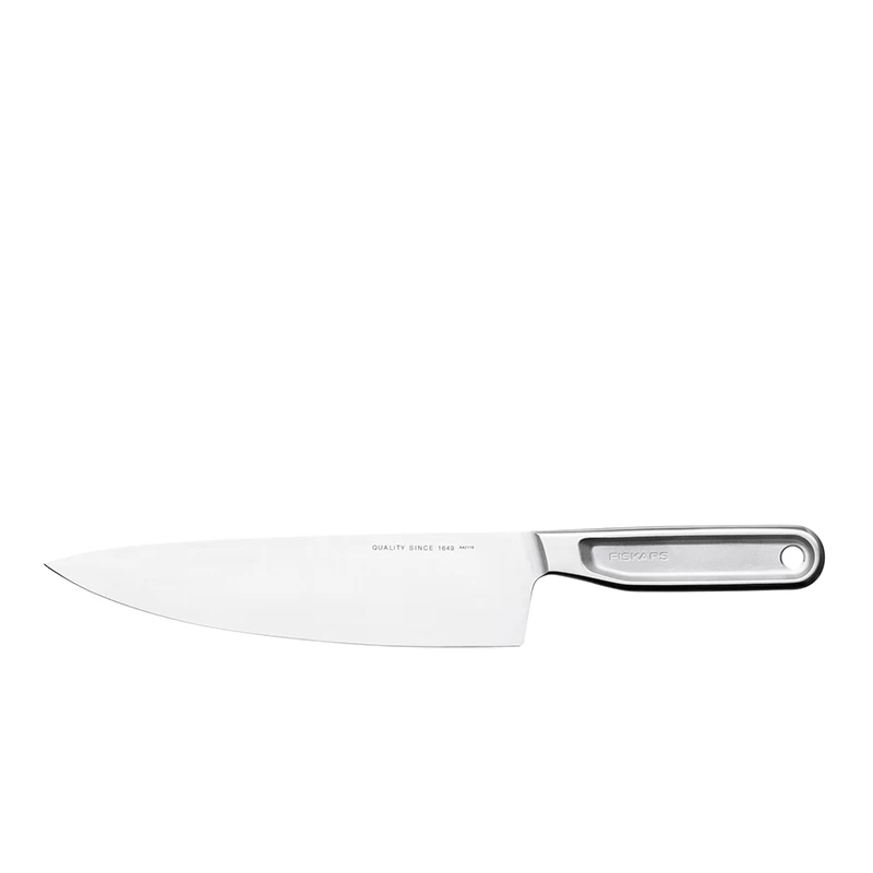 Leder du efter en kokkekniv i topklasse? Fiskars All Steel serie er altså bare kvalitet, og alle knivene i serien er fremstillet i det reneste og mest robuste rustfrie stål på markedet. Skæreegenskaberne med denne Fiskars kokkekniv er af professionel kvalitet takket været et ekstraordinært stærkt blad. Bladet er 20 cm og lavet af Japansk stål, der har et højt indhold af kulstof, der netop giver en holdbarhed udover det sædvanlige. Designet er helstøbt, robust og bare lækkert at se på og ikke mindst at have i hånden. Kniven er afbalanceret til perfektion, og ligger naturligt og komfortabelt i hånden, når du arbejder med den. Fiskars anbefaler at vaske kniven i hånden, da man aldrig kan gardere sig helt imod flyverust i opvaskemaskinen. Stålet holder længere ved at vaske kniven op i hånden.