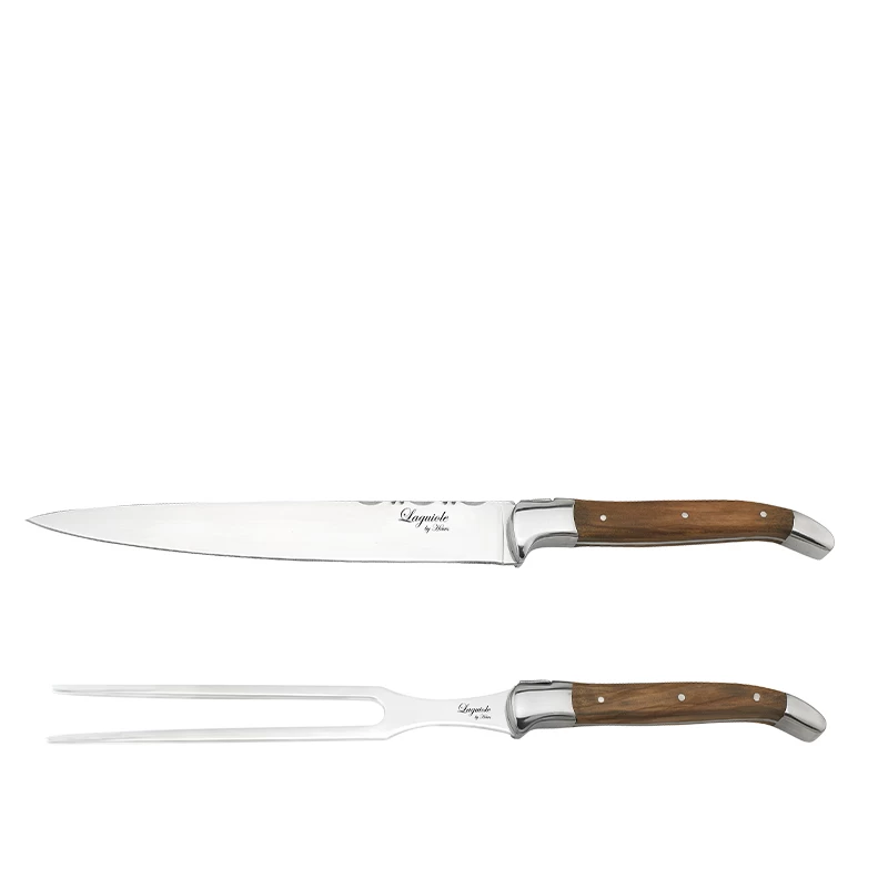 Dette skønne sæt fra Laguiole by HÂWS består af en udskæringskniv og en stegegaffel. Det perfekte makkerpar, når der skal skæres flotte skiver flæsesteg, kalveculotte eller oksemørbrad etc.