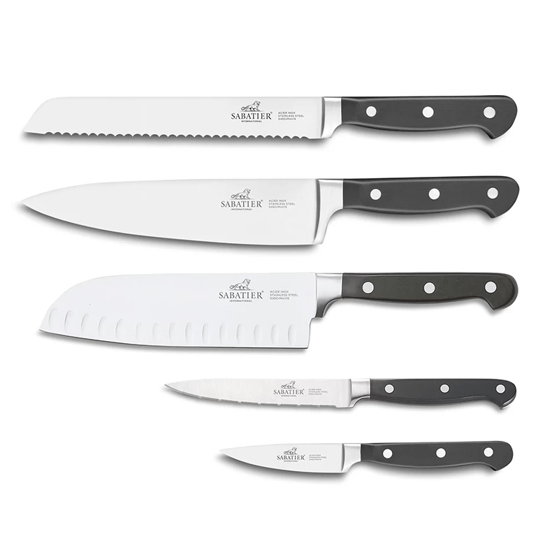 Pluton. Knivene har en optimal vægt og balance. Ligger behageligt i hånden. Gaveæske med kokkekniv 20 cm, brødkniv 20 cm, santokukniv 18 cm, tomatkniv 13 cm og urtekniv 9 cm.