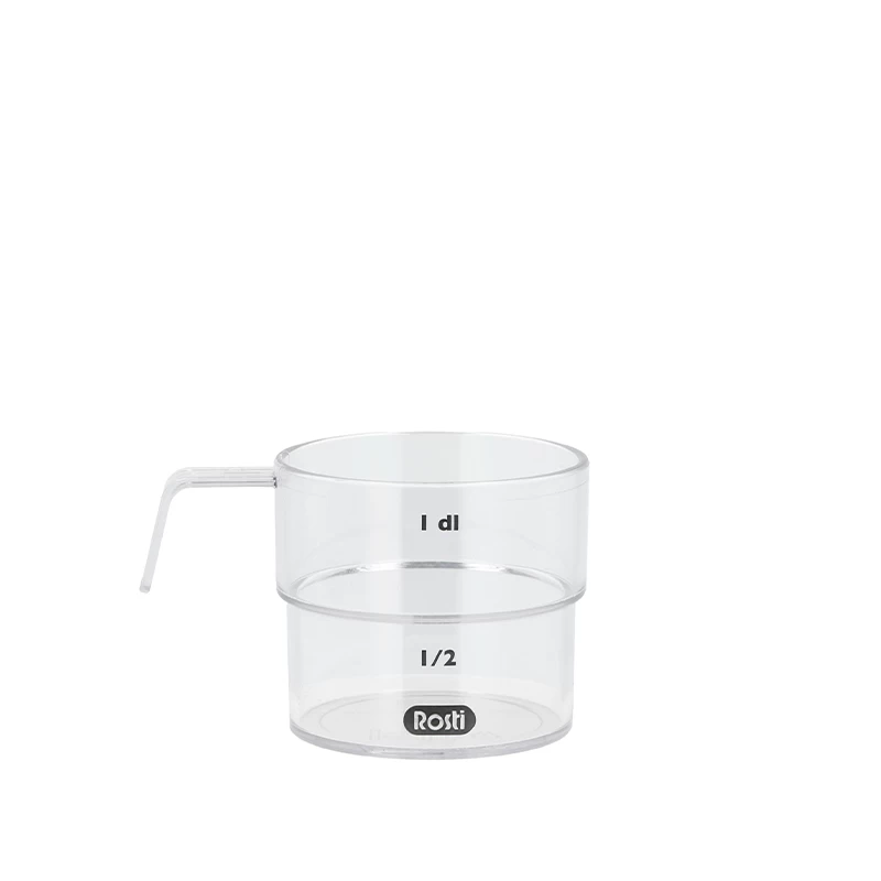 Smart gennemsigtig decilitermål fra Rösti som kan rumme en 100 ml/ 1 deciliter, og har en tydelig markering midtpå, som angiver 50 ml/0,5 deciliter. Håndtaget har et godt og sikkert greb. Decilitermålet er fremstillet i materialet SAN, som er meget transparent, og er utroligt holdbart.